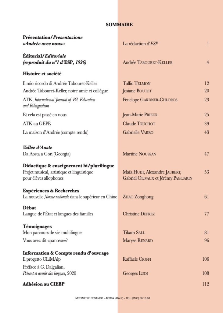 Presentazione/Présentation (Gabrielle Varro) ; Editoriale/Éditorial (Anemone Geiger-Jaillet); Histoire et société : Spazi dell’italiano in Estonia, fra plurilinguismi del passato e del presente Kristiina Rebane; Vallée d’Aoste: Le rôle des langues dans ma vie, un témoignage (Patrizia Bérard) ; Didactique & enseignement bi/plurilingue : Une mascotte pour enseigner les langues en VDA (A. Chicca, M. Garbolino Riva, G. Vernetto) Quelle évolution grâce aux réseaux sociaux? (D. Péaquin); Un ejemplo de experiencia memorable centrada en la acción en Lenguas Extranjeras Aplicadas (Ana-Isabel Ribera); Expériences, Réflexions & Recherches : Itinéraire linguistique d’un jeune Valdôtain. Vers l’engagement social en Amérique latine (Patrice Gard) ; Franc’afrique-afrique France. Sociolinguistique et politique(s) linguistique(s) (Martine Dreyfus) ; Expatriation et retour «chez soi»; expérience d’un choc culturel inversé (Asja Prohic) ; Alfred va vers les langues (Yannick Lefranc) ; Débat : Féminiser la langue, oui, mais d’abord définir la langue (Gilbert Dalgalian) ; Témoignage : «Une langue pour rire, une langue pour pleurer» (Vassilis Alexakis) ; Information Ethnorêma, association et revue (Moreno Vergari).