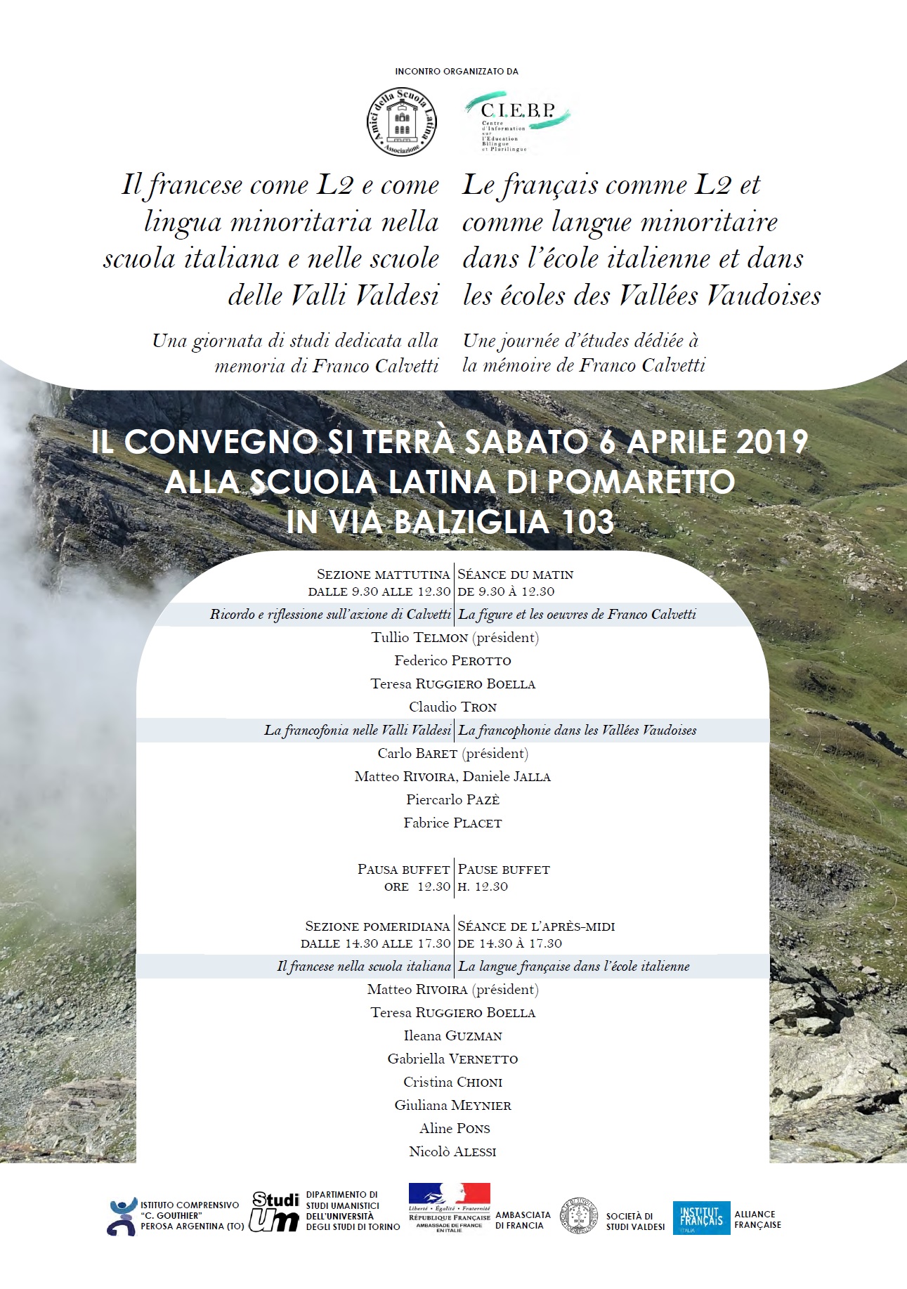 In coincidenza con il settantesimo anniversario dello Statuto speciale di autonomia della Regione Valle d’Aosta, il CIEBP e l’Università della Valle d’Aosta hanno organizzato una Giornata di studi sui temi del plurilinguismo e della pianificazione linguistica fra tre Paesi europei dell’area latina mediterranea, Italia, Francia e Spagna, caratterizzati da impostazioni profondamente variegate. Il convegno si è articolato in due sezioni, focalizzate rispettivamente sugli aspetti giuridici e linguistici del tema e nelle quali sono state rappresentate le situazioni specifiche di Italia, Francia e Spagna. Sono intervenuti come relatori Elisabetta Palici di Suni (Torino), Xavier Arbós Marín (Barcelona), Juan Jiménez Salcedo (Sevilla), Yannick Lefranc (Strasbourg), Fiorenzo Toso (Sassari), Gianmario Raimondi e Dario Elia Tosi (Aosta). [↝Programme]