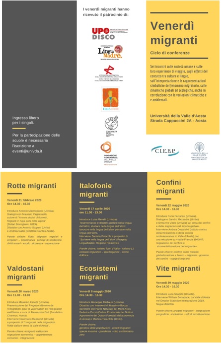 Par suite des mesures de prévention et de protection contre la diffusion du “Corona virus” les conférences « Venerdì migranti » sont reportées.